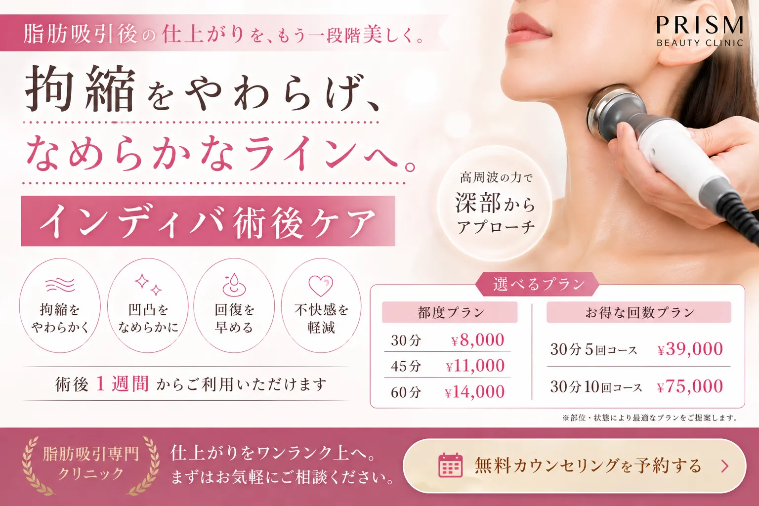 インディバの熱エネルギーが筋膜や皮膚を柔らかくし、脂肪吸引後に起こりやすい「硬縮」(皮膚が硬くなり、デコボコした状態)を早期に改善。自然な仕上がりを実現します。痛みや違和感の軽減